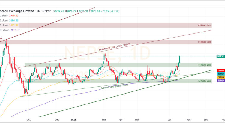 गत साता ५ कारोबार दिनका लागि बजार खुलेको थियो। गत साता नेप्से परिसूचक ५ प्रतिशत बढेर बन्द भएको थियो। अघिल्लो साता २७३१.८० विन्दुमा बन्द भएको नेप्से, गत साता ५.०८ प्रतिशत अर्थात १३८.८३ अंक बढेर २८७०.६३ विन्दुमा पुगेको छ।  जसमध्ये ४ कारोबार दिन नेप्से बढेर बन्द भएको थियो १ कारोबार दिन घटेको थियो।  साप्ताहिक रुपमा नेप्सेले गत साता बुलिश पिन बार बनाएको छ। त्यसैगरी, गत साताको अन्तिम तीन कारोबार दिन पनि नेप्सेले हरियो मैनबत्ती बनाएको थियो। यसले सो साता र सो दिनहरुमा बजारमा खरिदकर्ता हाबी रहेको संकेत गर्दछ।  गत साता नेप्से परिसूचक बढेसँगै गत साताको प्रतिरोध क्षेत्र, आगामी साताको लागि टेवा क्षेत्र रहेको छ।   गत साता २७५० देखि २८०० सम्म रहेको प्रतिरोध क्षेत्र आगामी दिनको लागि टेवा क्षेत्र बनेको छ। आगामी दिनमा नेप्सेले उकालो यात्रालाई निरन्तरता दिएका ३००० देखि ३०५० को क्षेत्रमा प्रतिरोधको सामना गर्ने देखिन्छ।